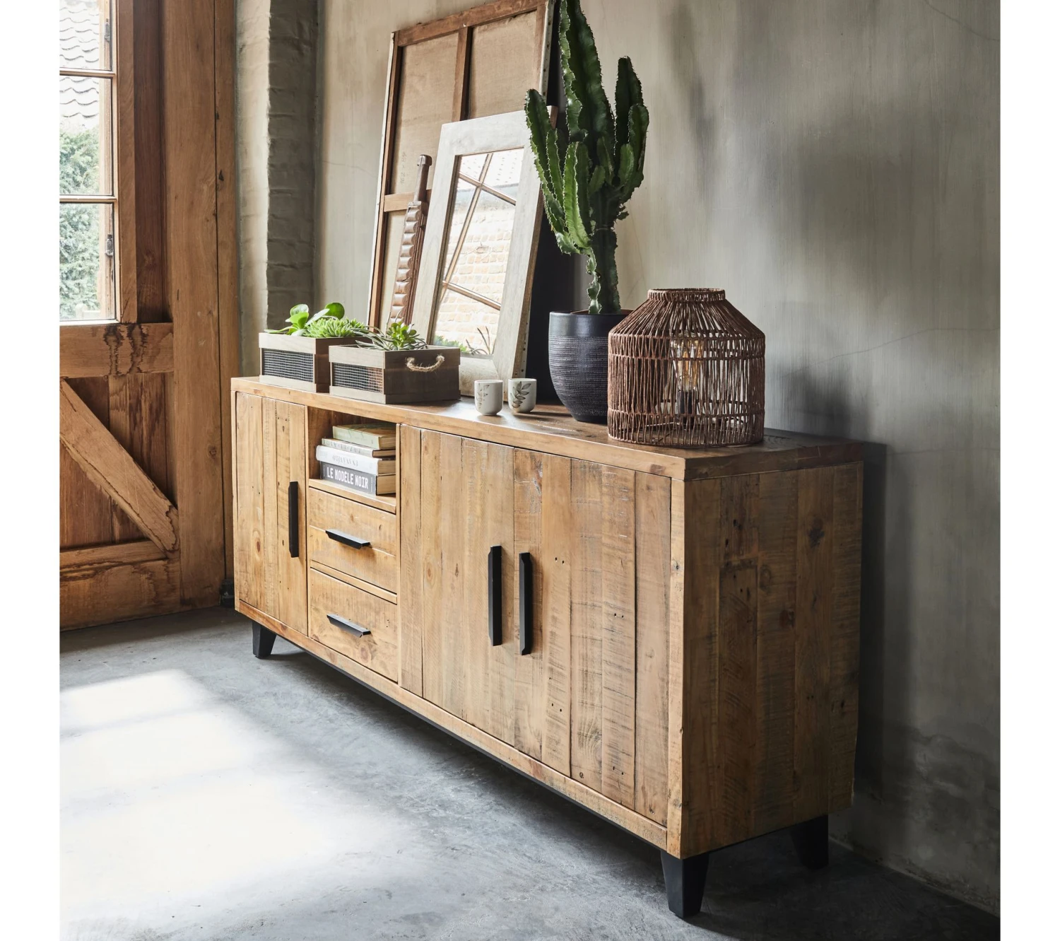 Craquez pour l’esprit campagne de ce buffet couleur pin qui réchauffera immédiatement l’ambiance de votre pièce. Les pieds noirs assortis aux poignées ajoutent une touche moderne incontestable. Vous pourrez associer idéalement ce buffet avec une table en bois de la même teinte. Réalisé en pin recyclé, il se montrera robuste.