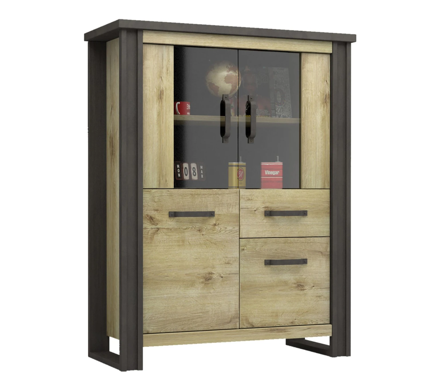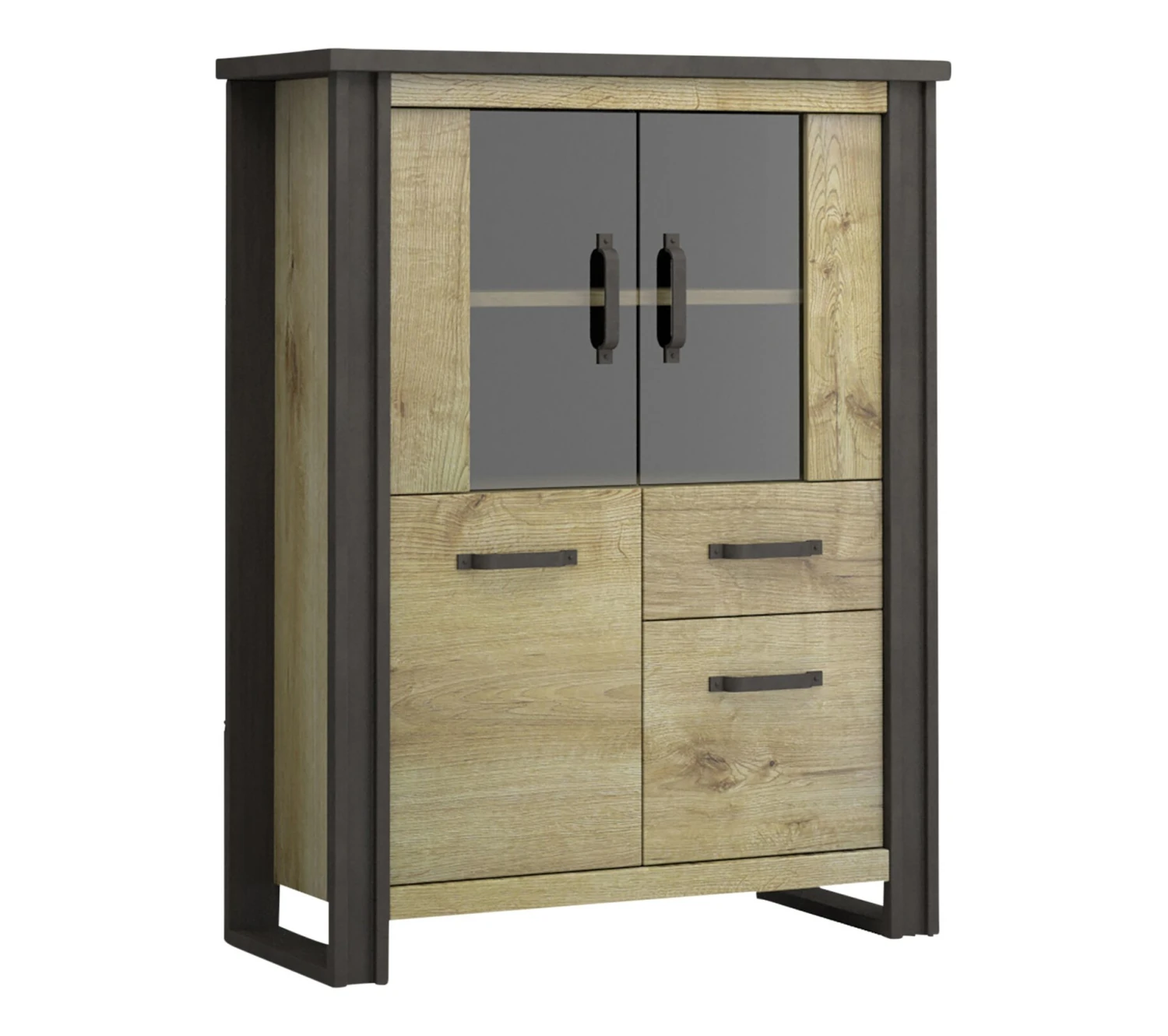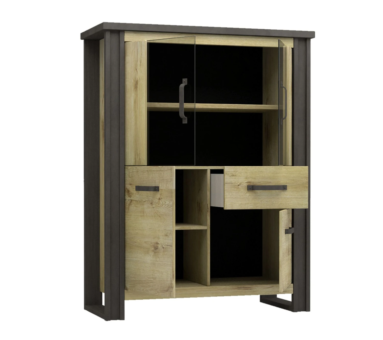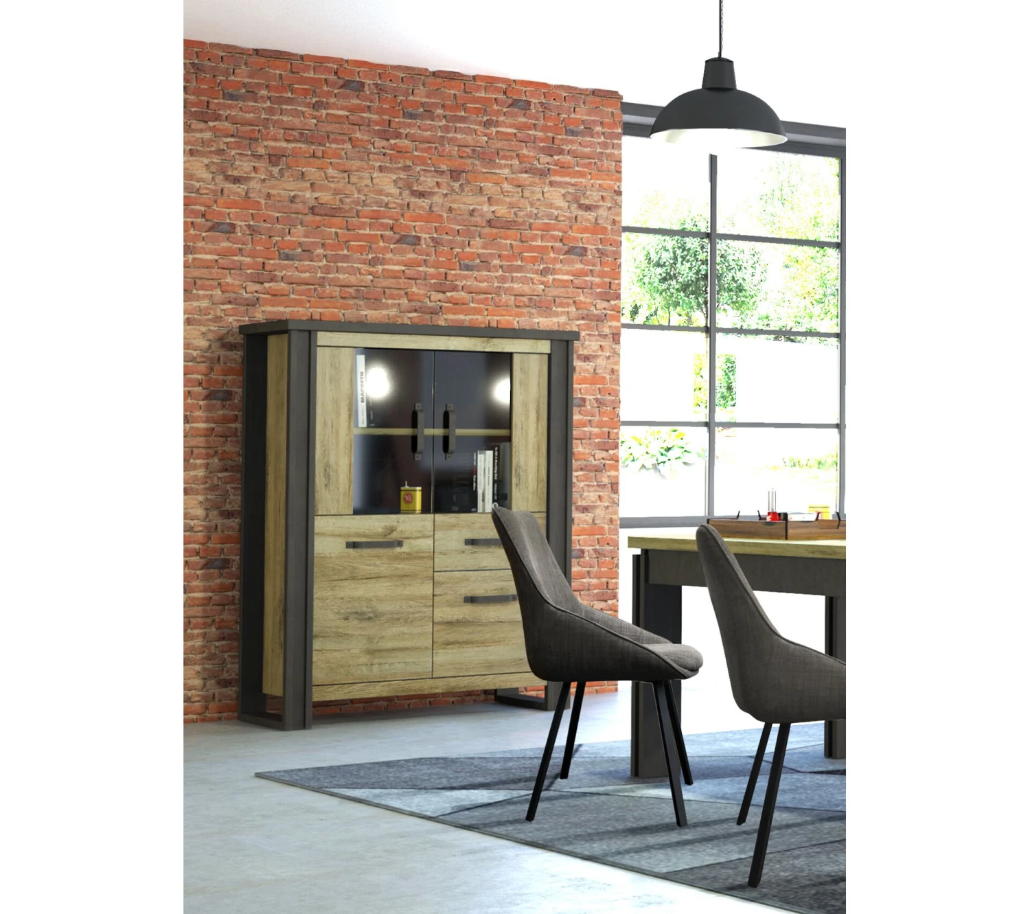 Ce buffet imitation chênese distingue par ses montants latéraux contrastants faisant également office de piètement. Réalisés dans une teinte plus sombre, ils s’associent parfaitement à d’autres meubles de style industriel. Pour créer une décoration coordonnée, vous pouvez opter pour le buffet bas et la table de salle à manger de la même collection.