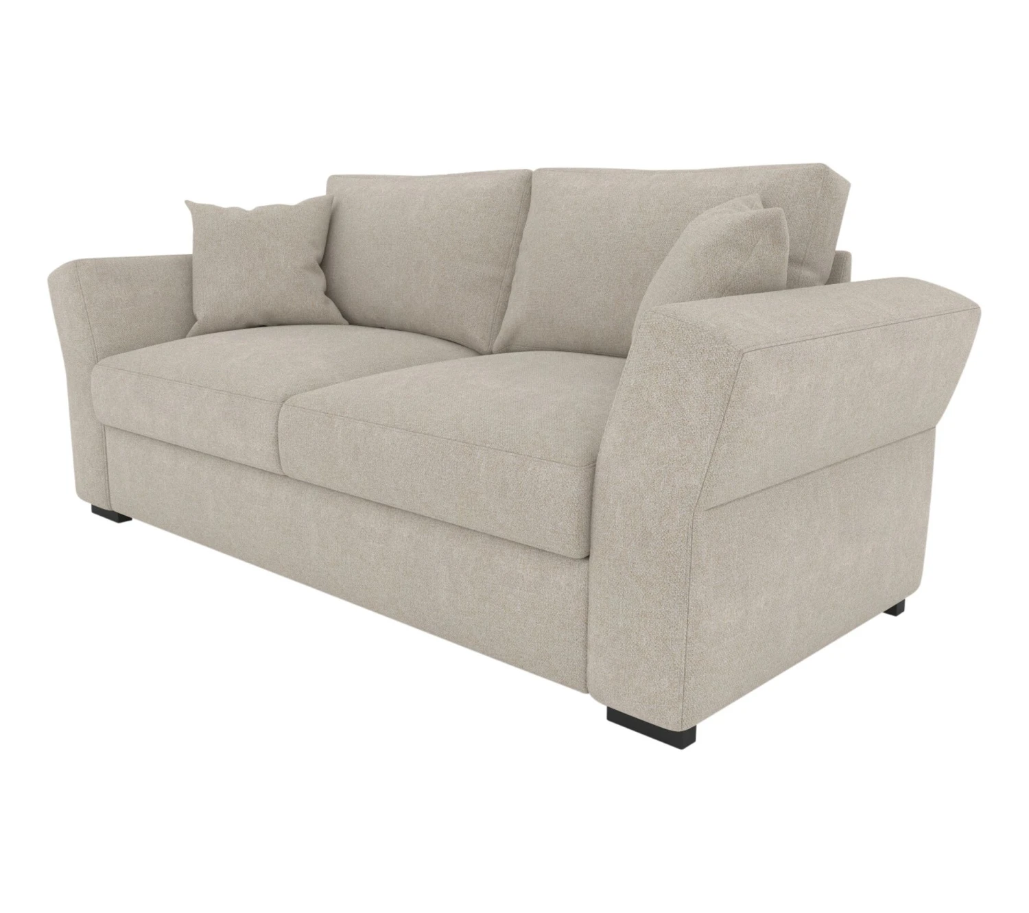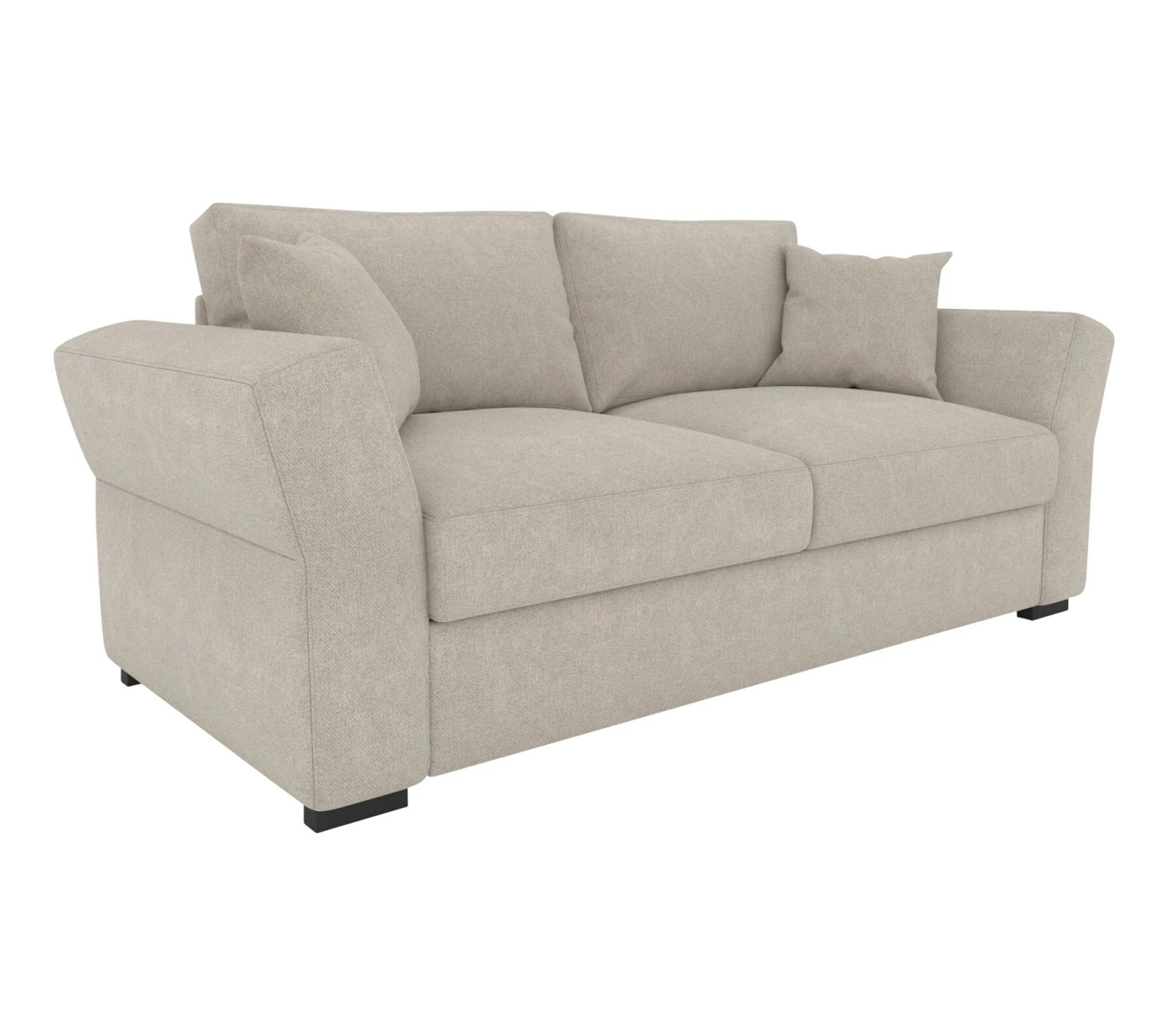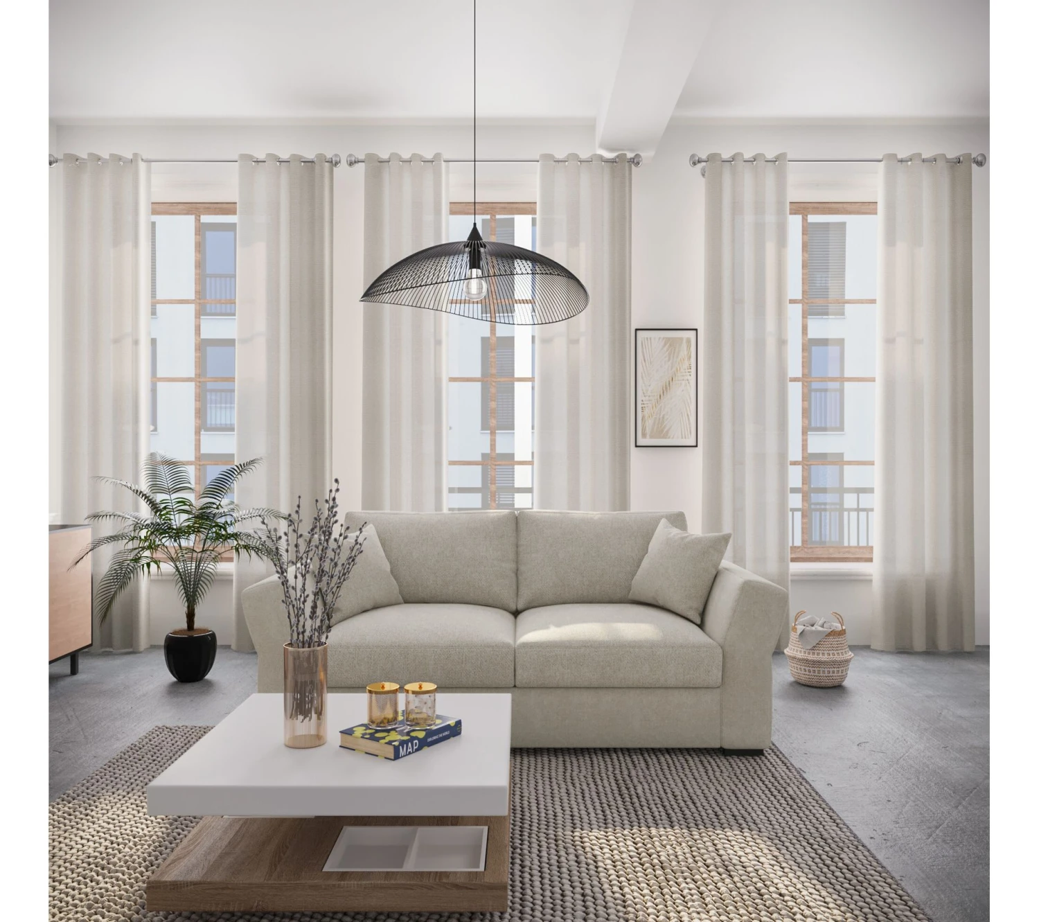 Ce canapé 3 places offre un grand confort. Son assise est en mousse polyéther d’une densité de 28 kg/m3 et son dossier intègre 25 % de plumes de canard, pour un effet ultra moelleux. Les petits coussins décoratifs sont livrés avec ce canapé beige.