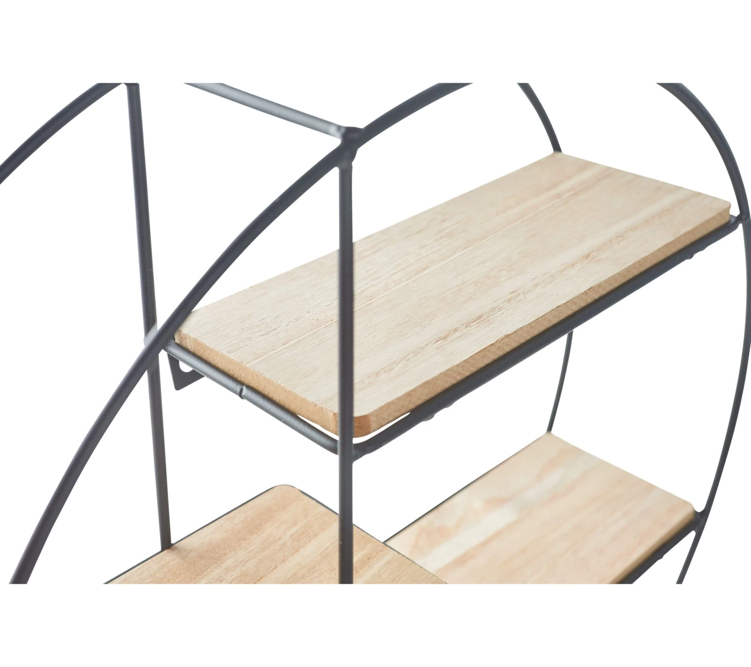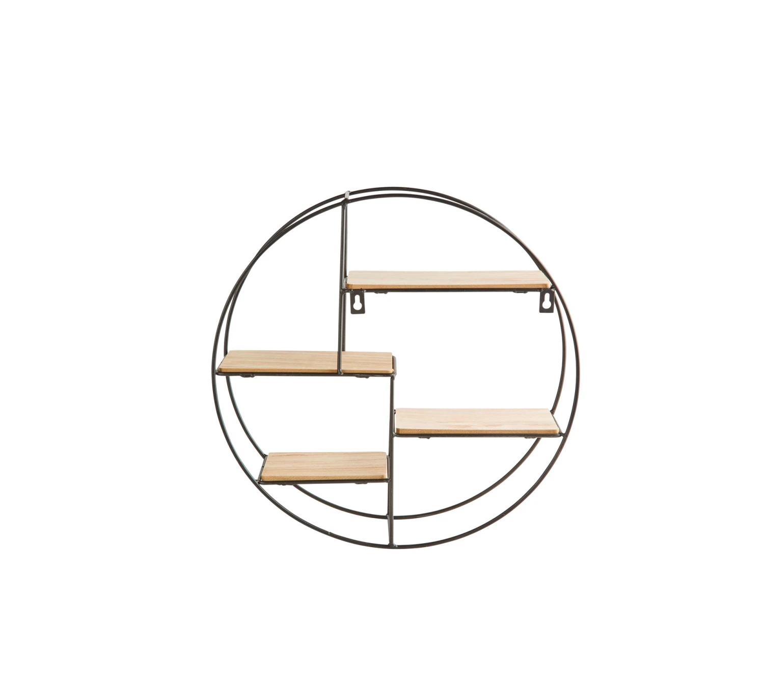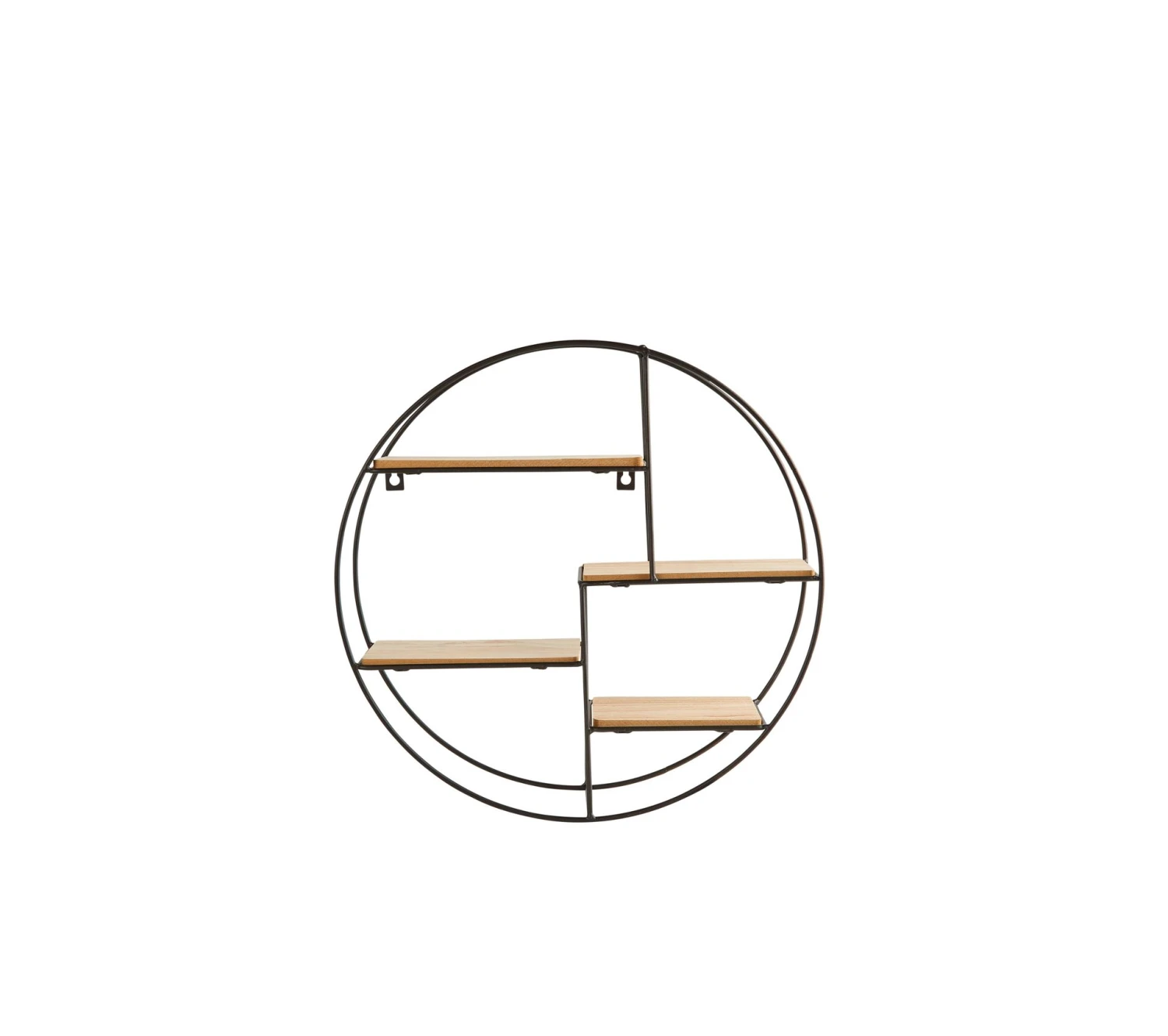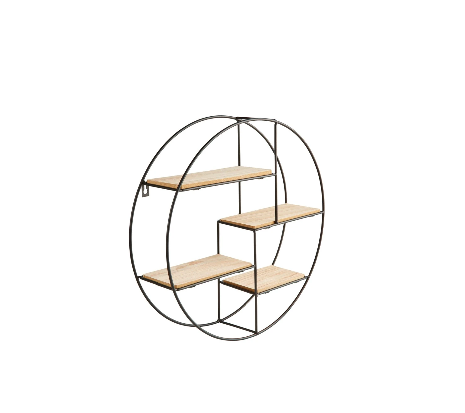 Une étagère organiséePrésentez vos bibelots favoris ou organisez quelques livres sur l’étagère CIRCLE. Aussi élégante que pratique, cette étagère murale se révèle solide et durable avec sa structure circulaire en fil de métal épais. Réparties chacune sur un niveau, quatre tablettes bien stables, décalées les unes par rapport aux autres, accueillent vos petits objets. Remarquable par son design, cette étagère d’un diamètre de 40 cm occupe peu de place sur un mur. Pour l’accrocher, vous disposez de fixations à l’arrière de la structure. Une fois vissée au mur, elle ne bouge plus. Facile à entretenir, elle se dépoussière avec un chiffon doux et sec.Un design industrielMélange de fibres de bois et de fer, cette étagère noire et naturelle à l’allure légère apporte à votre intérieur une touche industrielle. Son esthétique bicolore s’associe à une forme ronde et déstructurée pour lui donner un design unique, parfaite pour apporter fraîcheur et originalité à une décoration moderne.