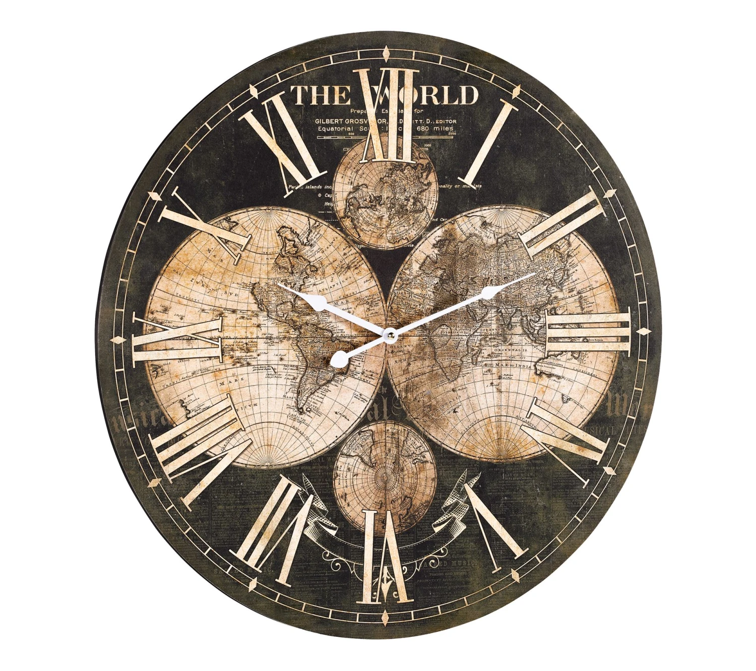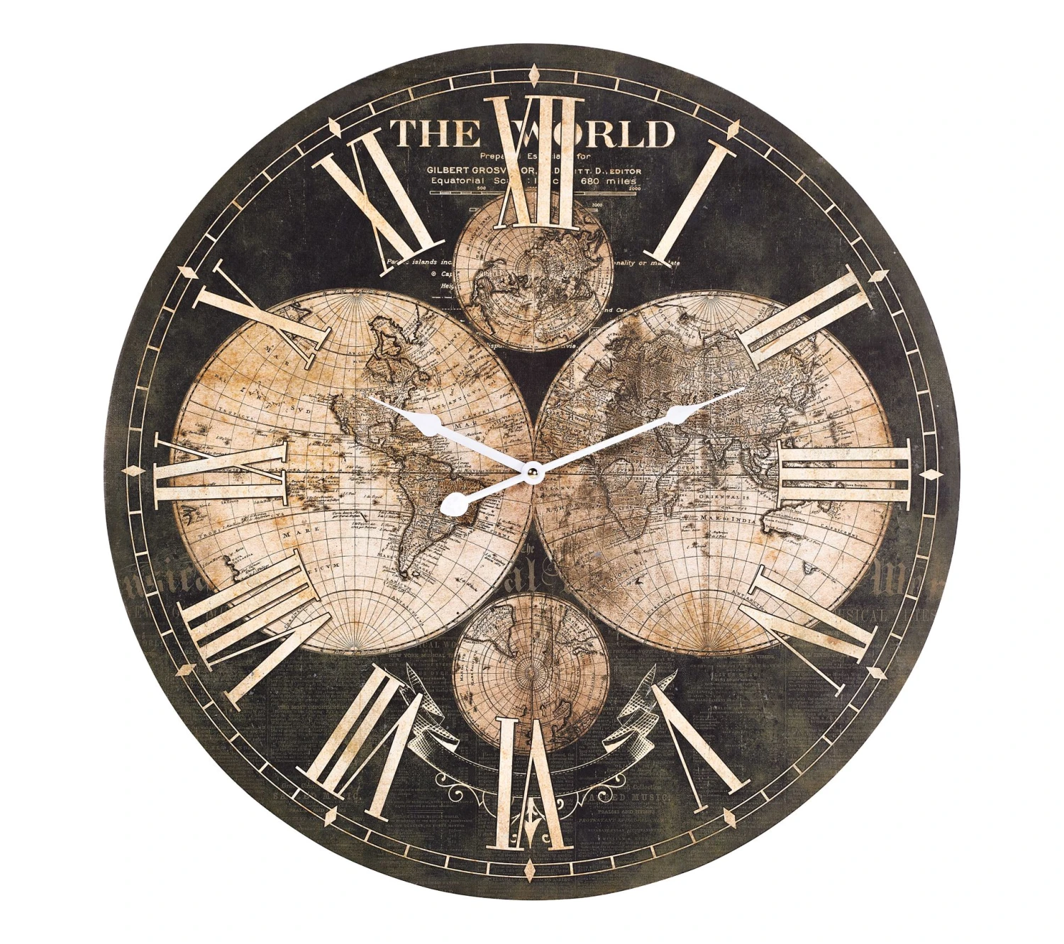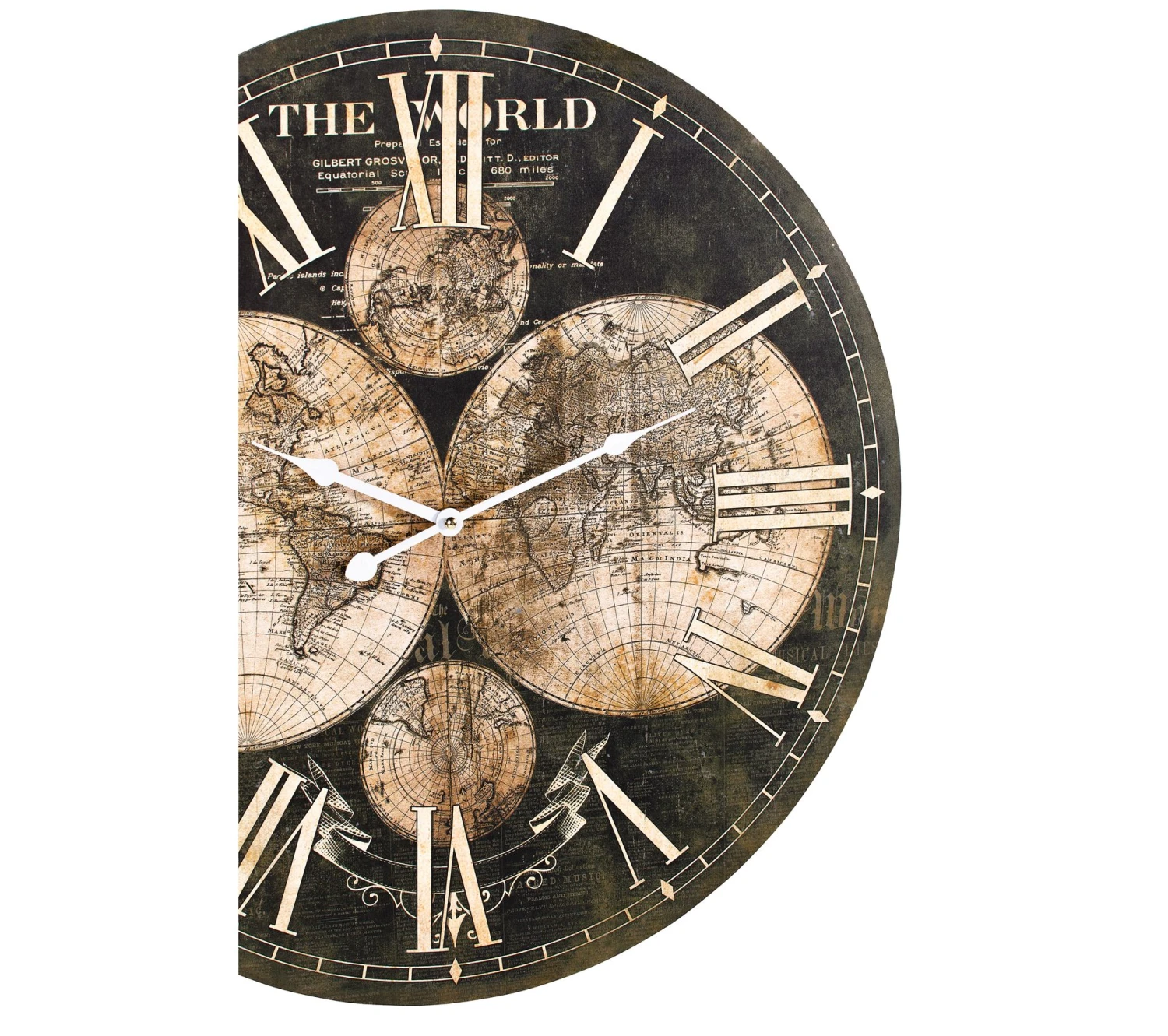 Craquez pour cette horloge noire et dorée dont le fond décoré représente une carte du monde. Son style vintage se mariera facilement avec du mobilier ancien ou avec des meubles contemporains, selon vos préférences. Conçue en panneaux de fibres de moyenne densité, elle est légère et se fixe directement au mur.