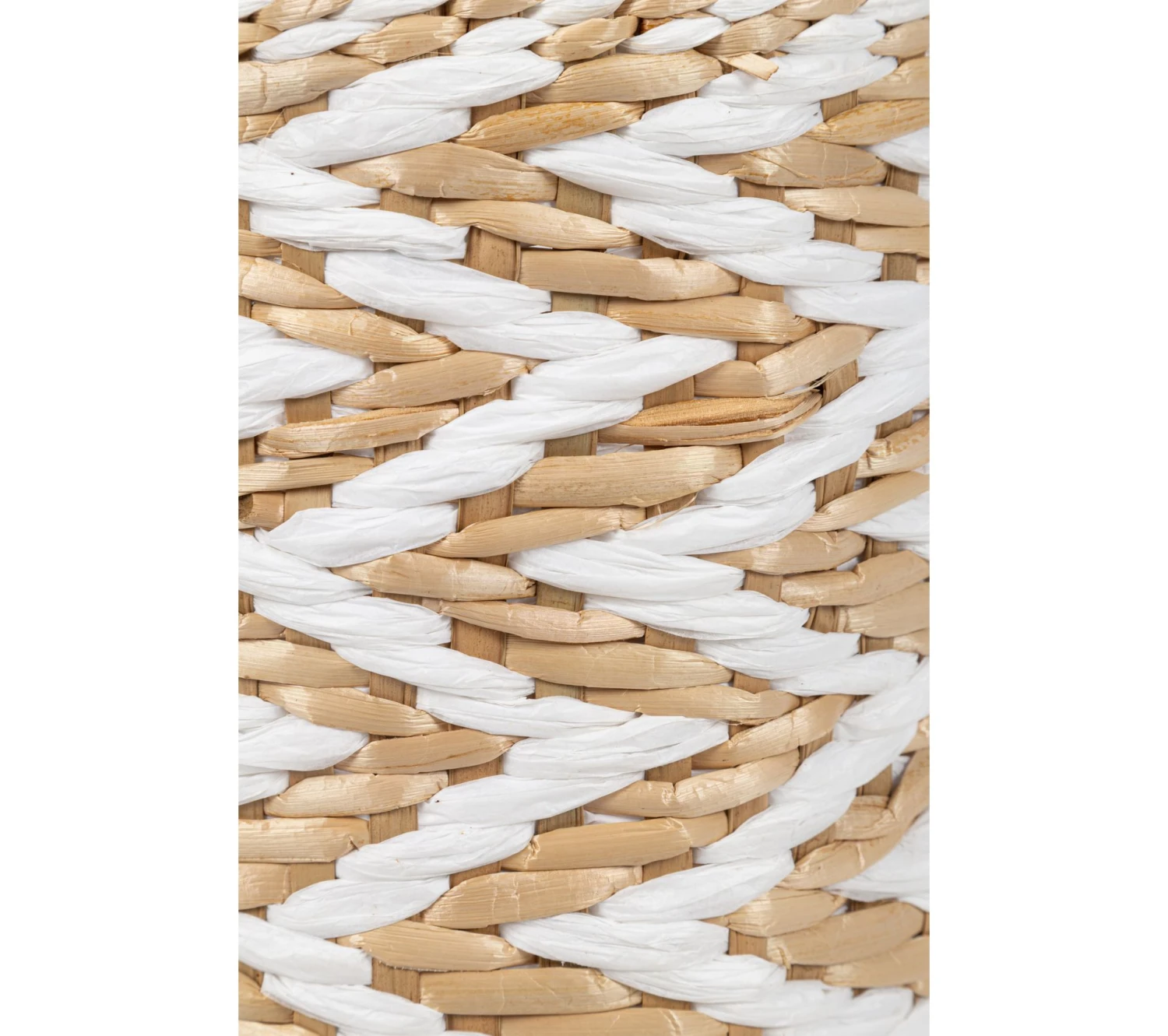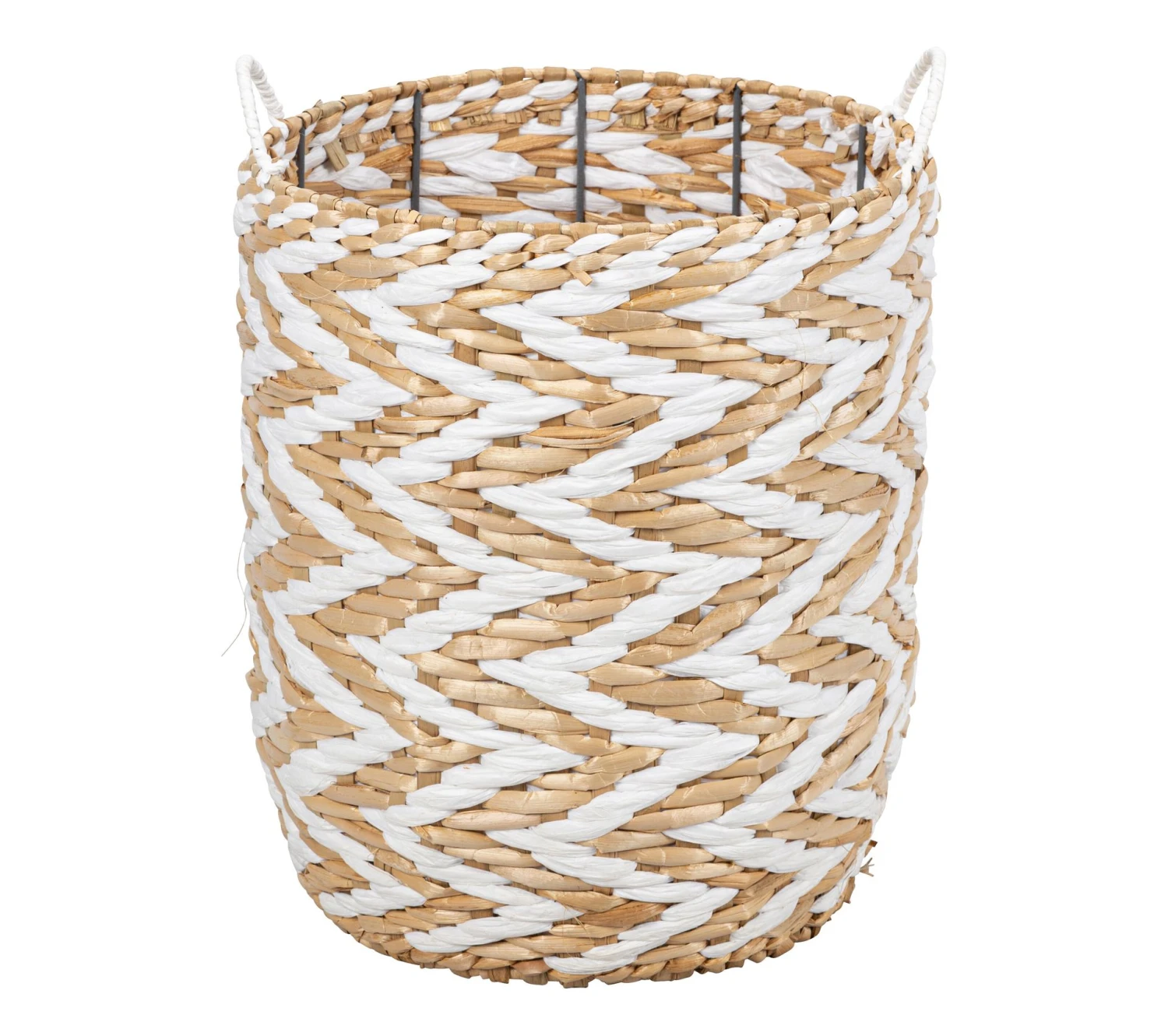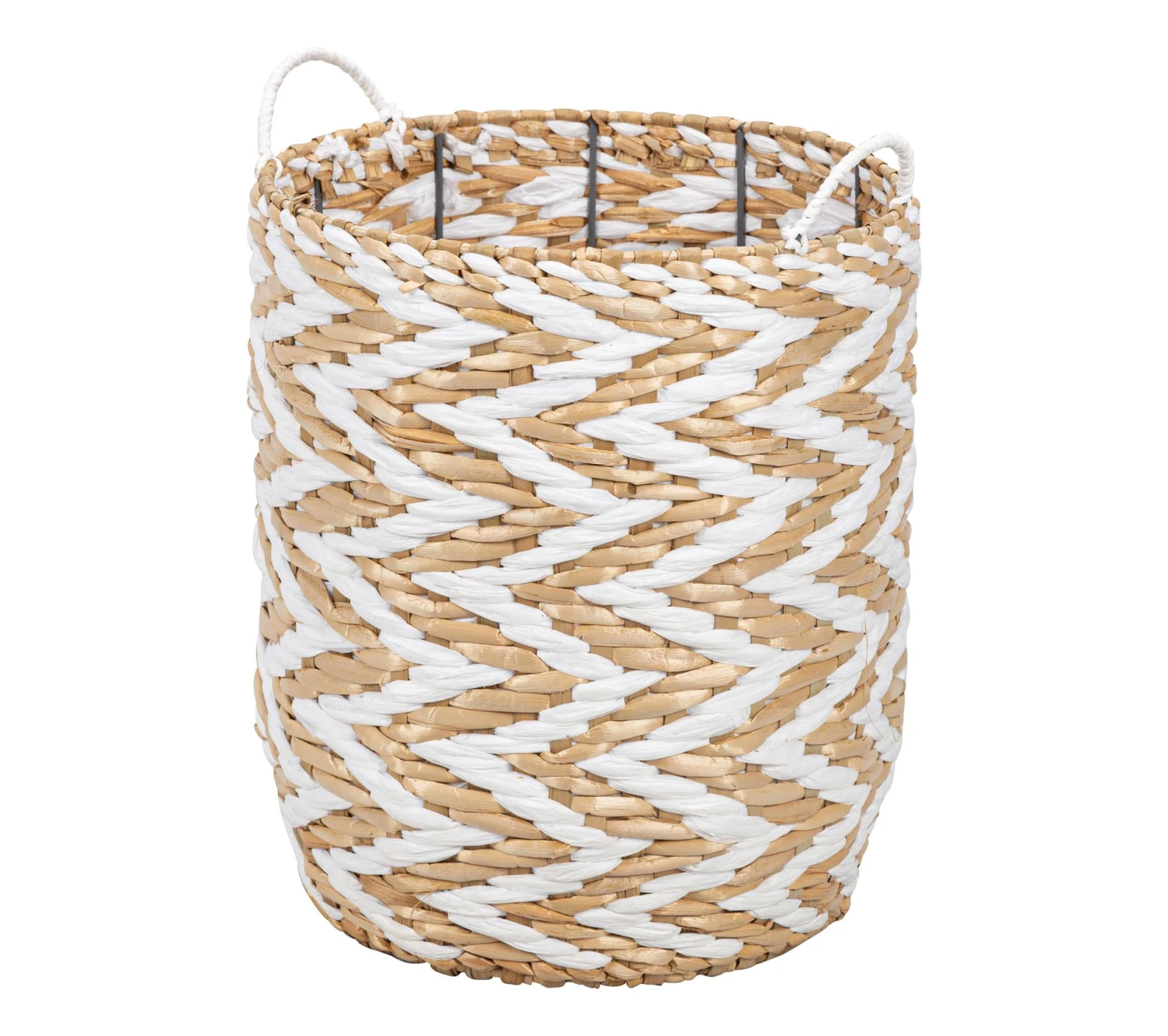 Laissez-vous séduire par ce panier blanc et naturel qui s’habille de motifs d’inspiration ethnique. Il se mariera à merveille avec des éléments naturels pour créer un décor bohème. Entièrement réalisé à la main, ce panier est conçu en jonc et en paille de papier avec une structure en fer.