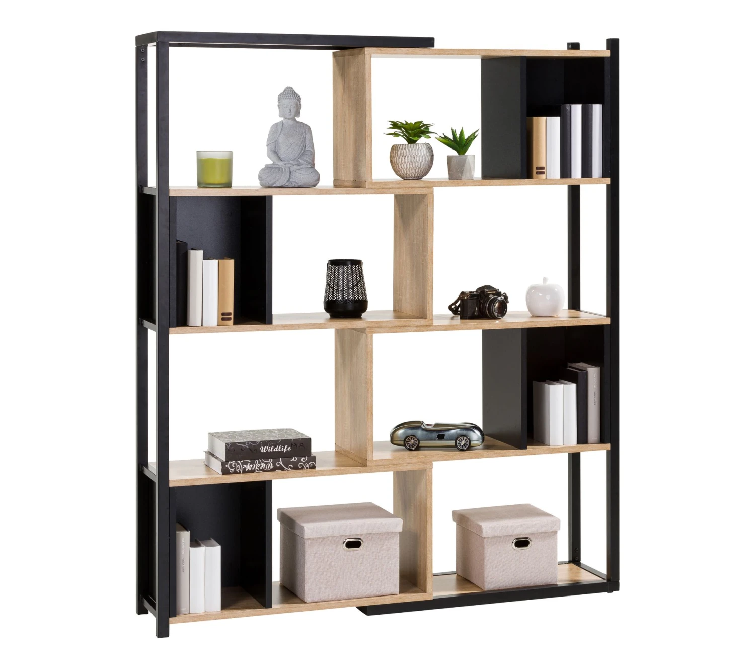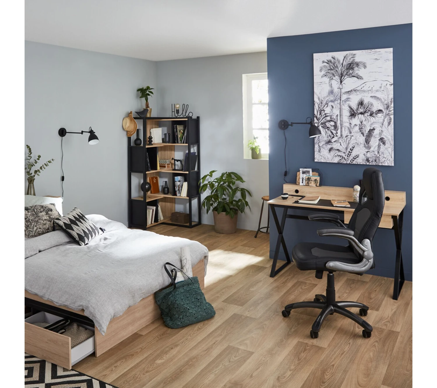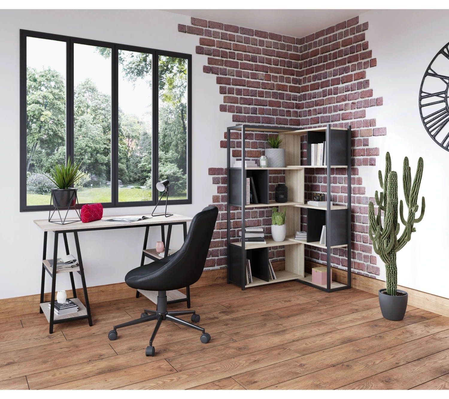Particulièrement tendance, le style industriel fait la part belle aux matières brutes et aux finitions naturelles. Avec cette séparation extensible de 80 à 152 cm, vous disposez d’un meuble de rangement pratique et adaptable aux moindres espaces de votre intérieur. Assortissez cette séparation d’angle coloris imitation chêne et noir avec un bureau en acier pour un effet coordonné.