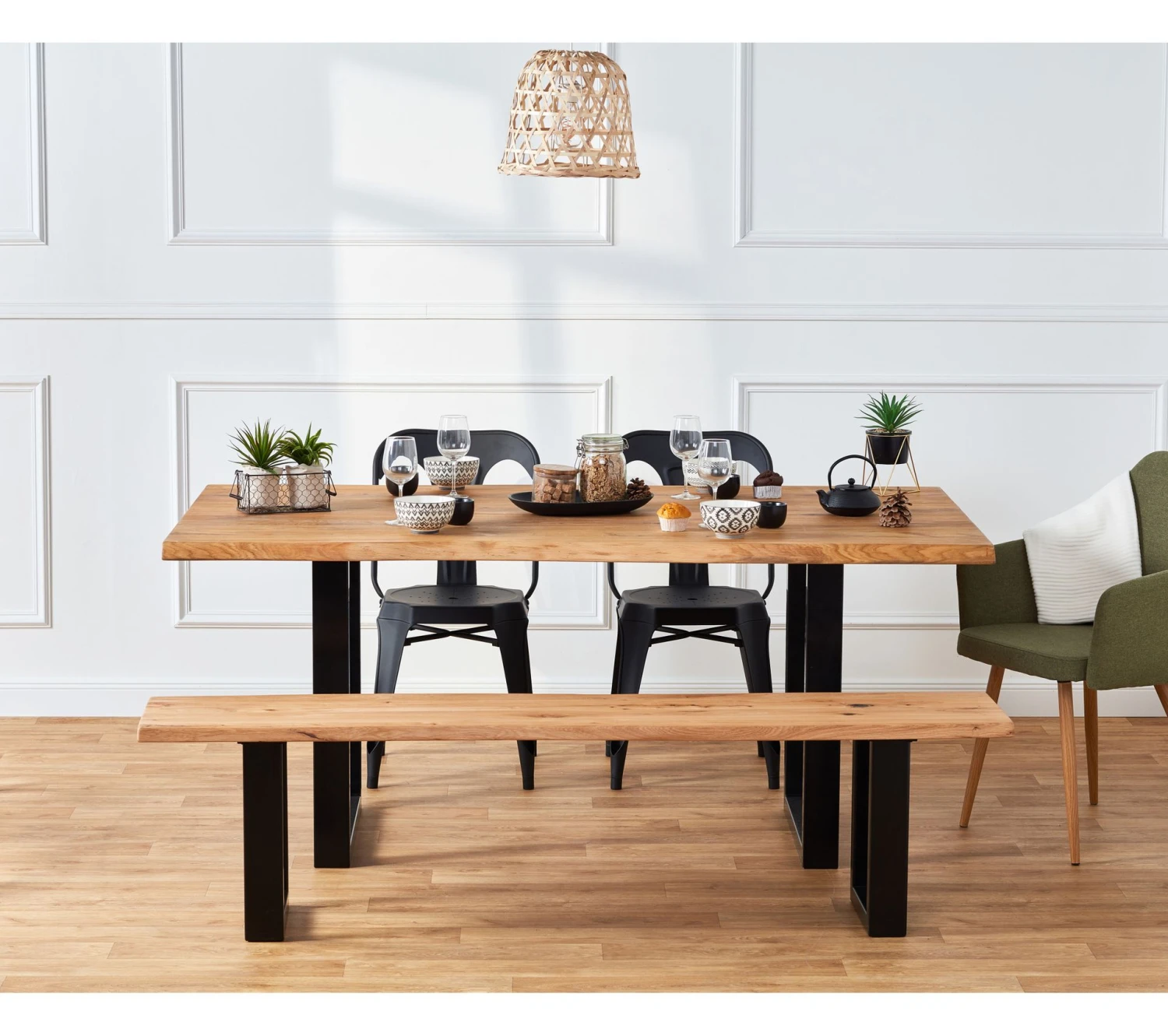 Vous pourrez compter très longtemps sur cette table chêne et noir, dont les matériaux de fabrication aussi bien que les caractéristiques multiplient les garanties de solidité. En effet, constituée d’un plateau en chêne massif et de pieds en acier, cette table de dimensions L. 180 x H. 75 x P. 100 cm associe la robustesse du bois massif à la durabilité du métal. Avec son épaisseur de 40 mm et sa finition huilée, son plateau constitue un support à l’épreuve non seulement du temps mais aussi de l’humidité. Pour l’entretenir, il vous suffira de diluer un peu de savon noir dans de l’eau tiède.