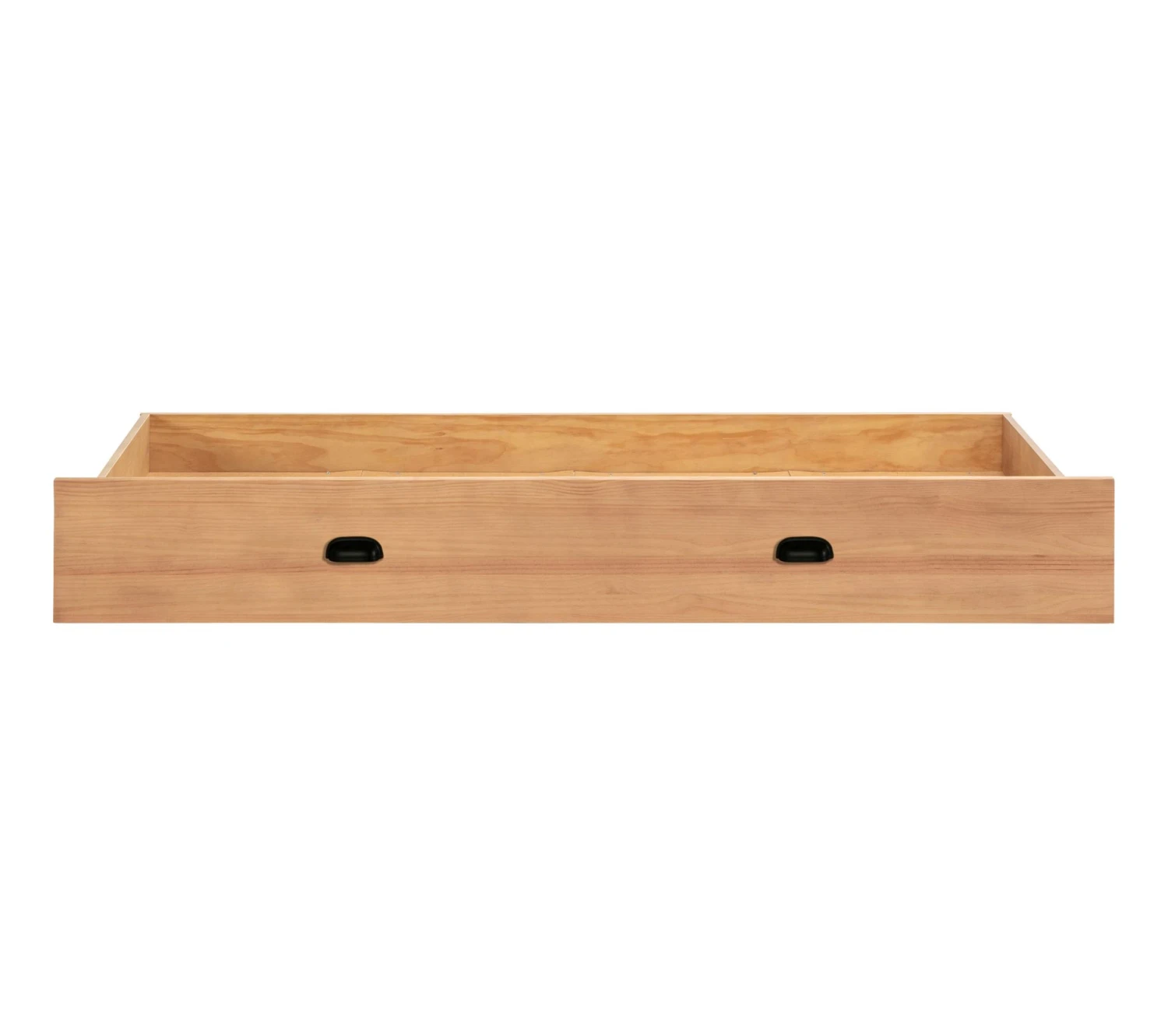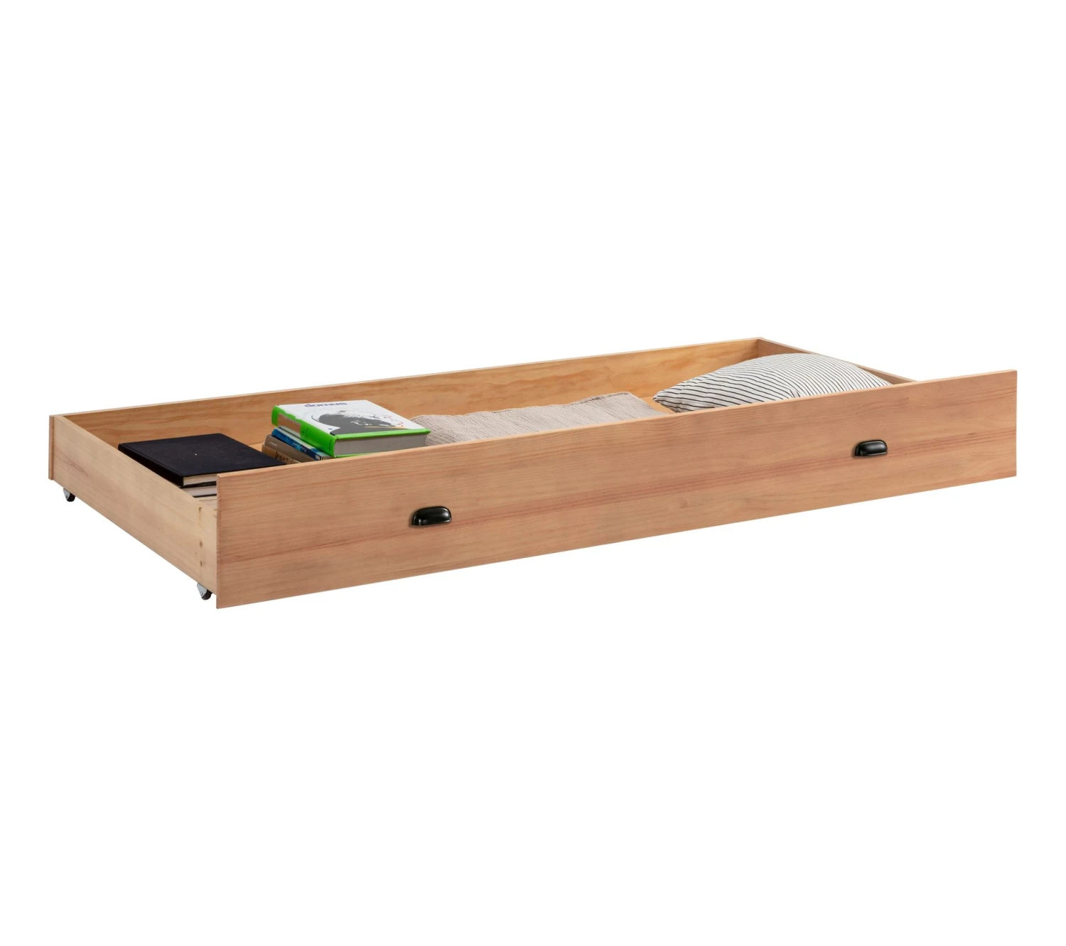 Le tiroir de rangement ARTHUR 2 a été conçu pour compléter le lit superposé de la même collection. Il trouve sa place en dessous du sommier du bas et permet de profiter d’un espace de stockage pratique pour du linge de lit, quelques jouets ou des accessoires vestimentaires. Ce tiroir de rangementpossède des roulettes qui assurent une ouverture facile. Ce tiroirest réalisé dans des matières de qualité : les montants sont en pin massif verni, le fond est en panneaux de fibres et les poignées sont en métal.